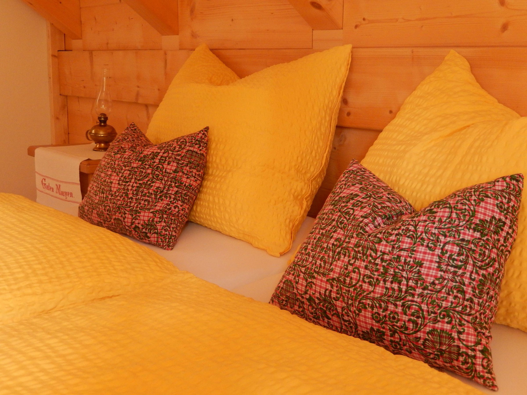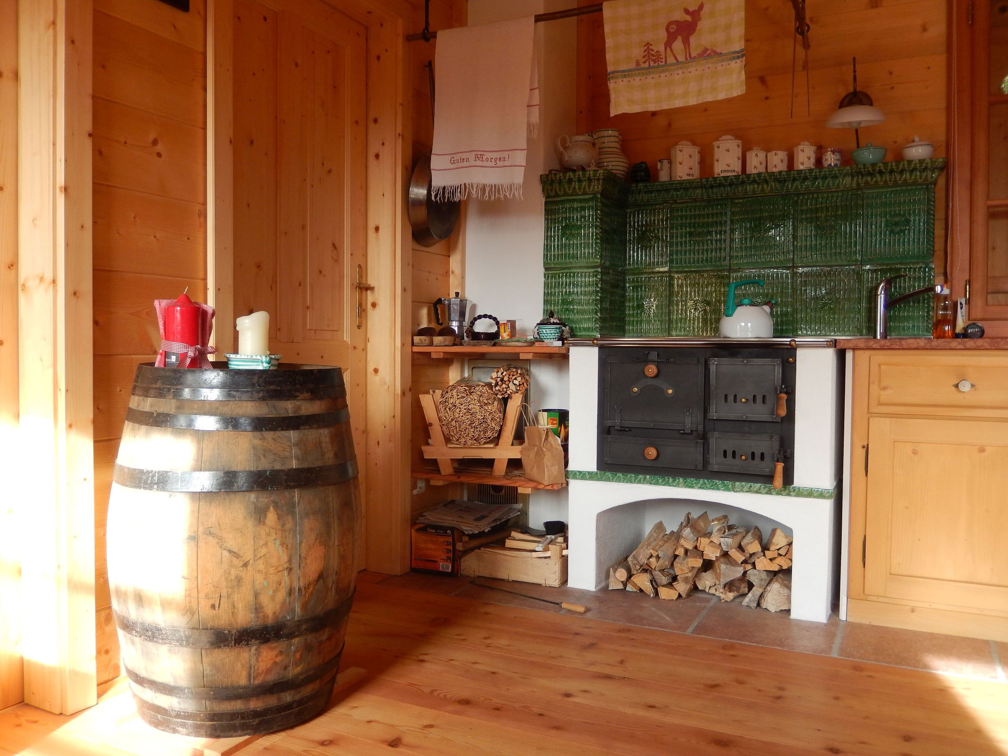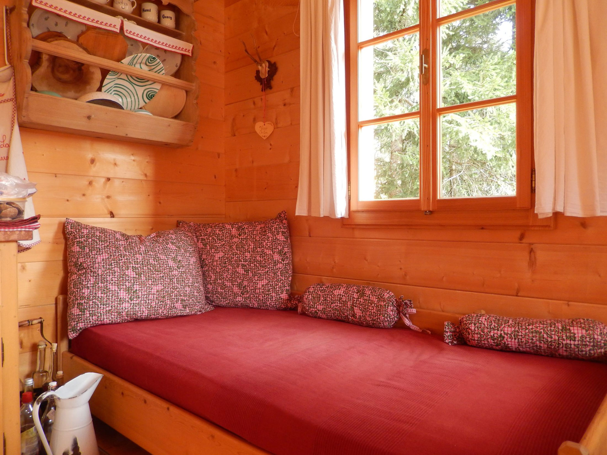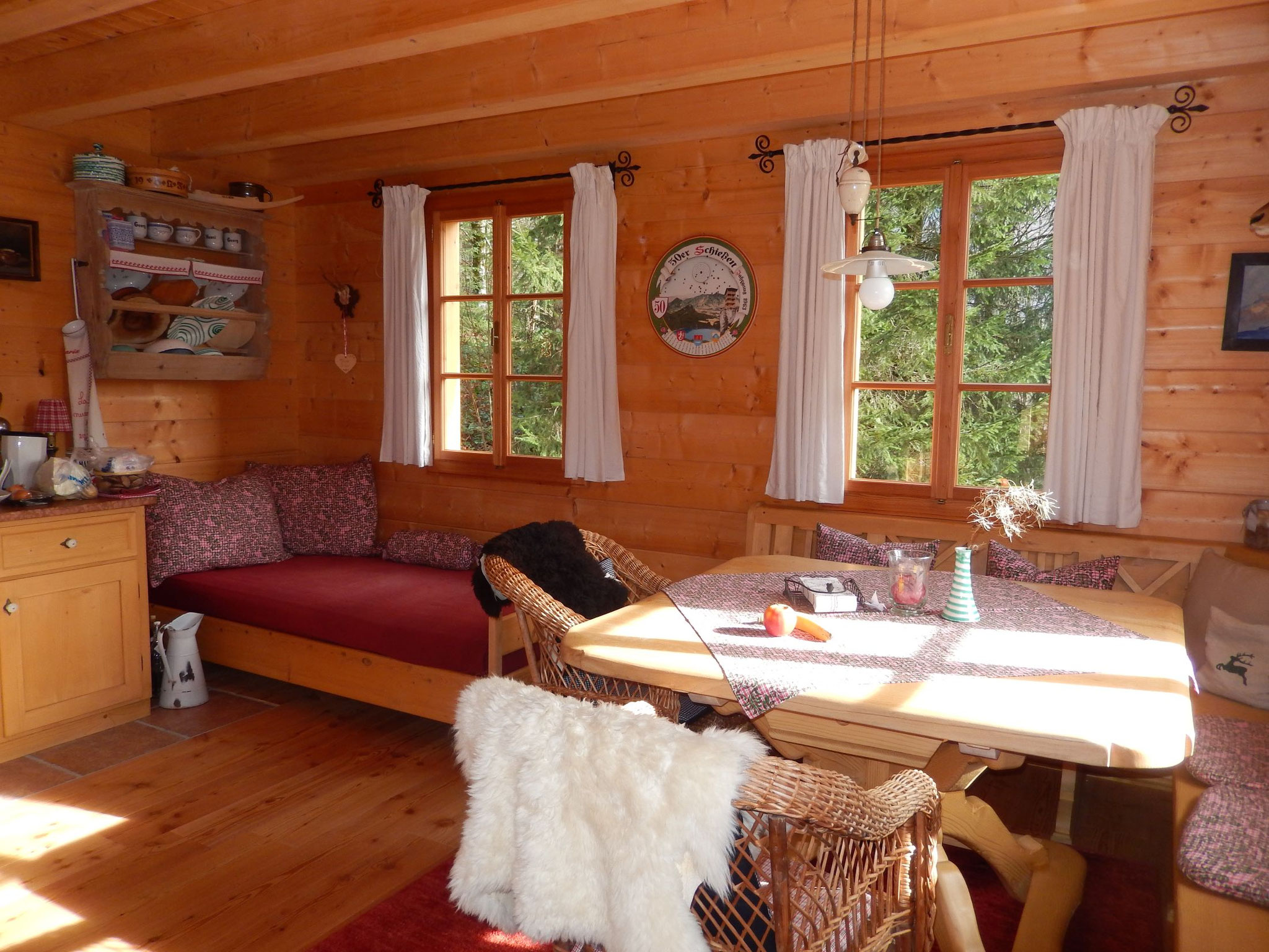 At the heart of the hut is a spacious living area featuring a traditional wood stove. On the cozy corner bench, you can gather around the large cross table to eat, drink, play games, converse, and laugh together. A traditional bed bench invites you to relax while the fire crackles in the stove. A unique highlight is the 25 m² underground cellar beneath the hut, which naturally cools your food and beverages.