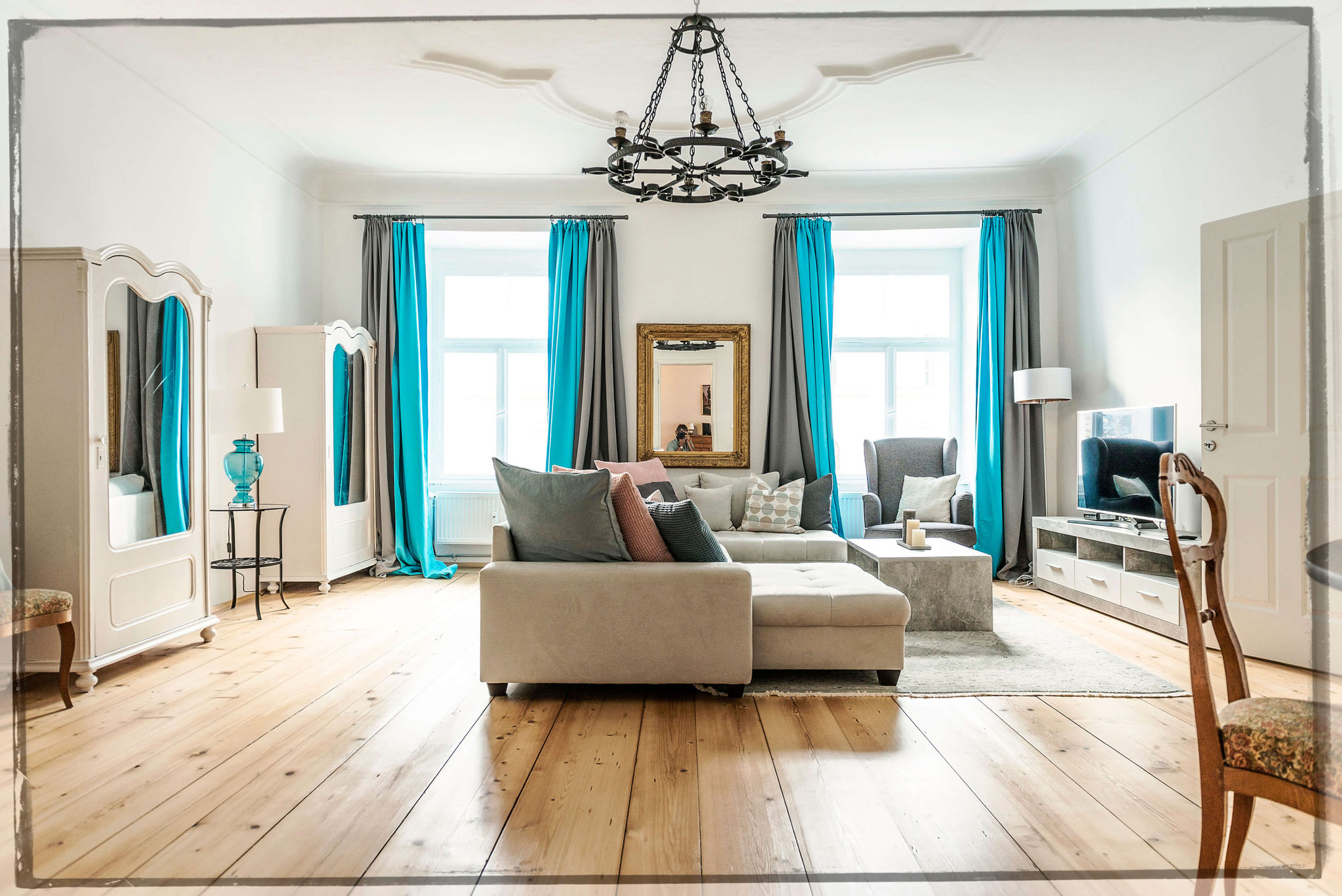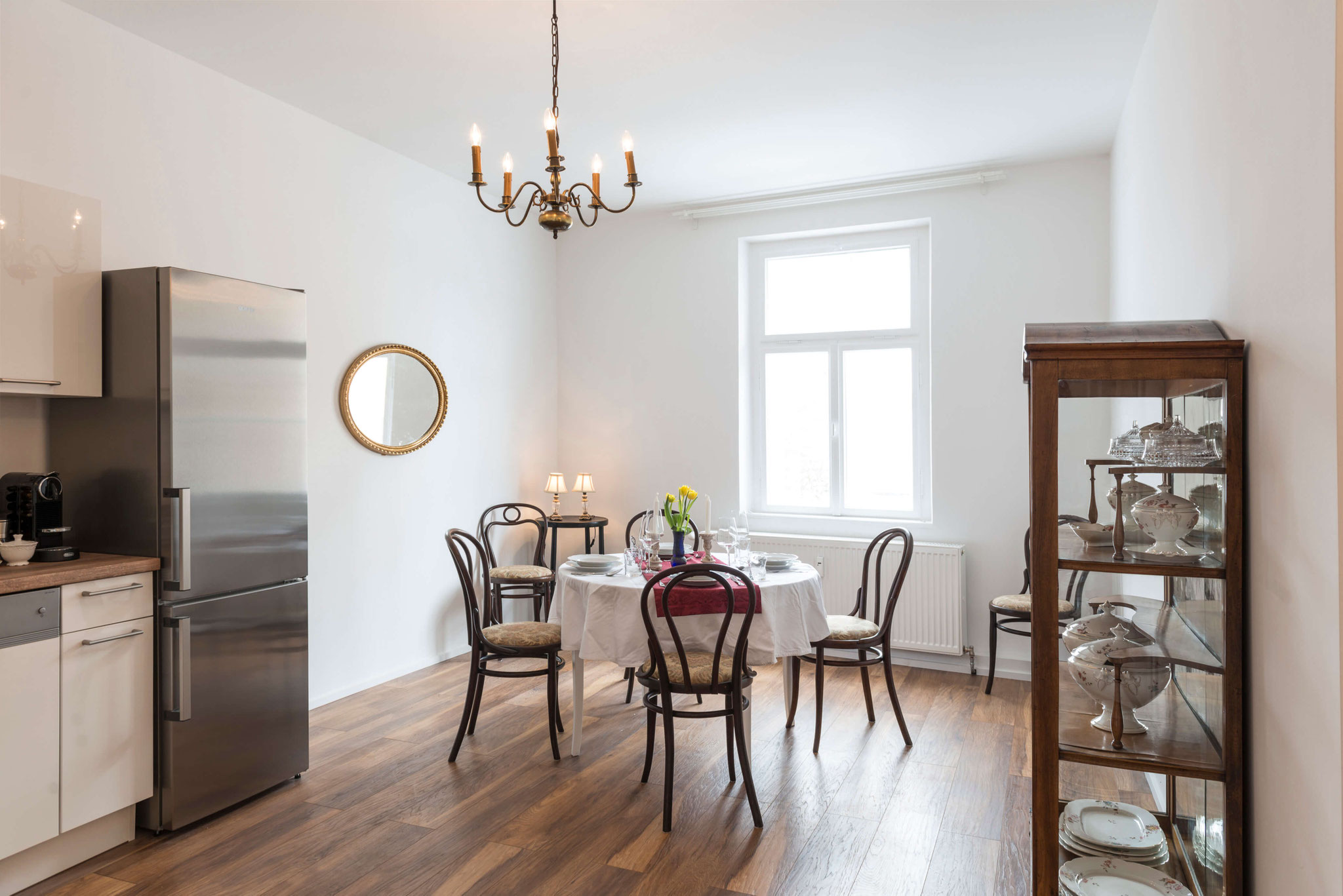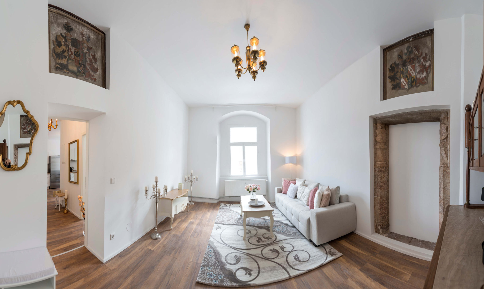Located on the first floor, this apartment offers 127 sqm of space for relaxation. You can still feel that the emperor resided here in the 16th century. Modern, cozy sofas with fresh color combinations, a heavenly four-poster bed, and a generous dining table for you and your loved ones await.