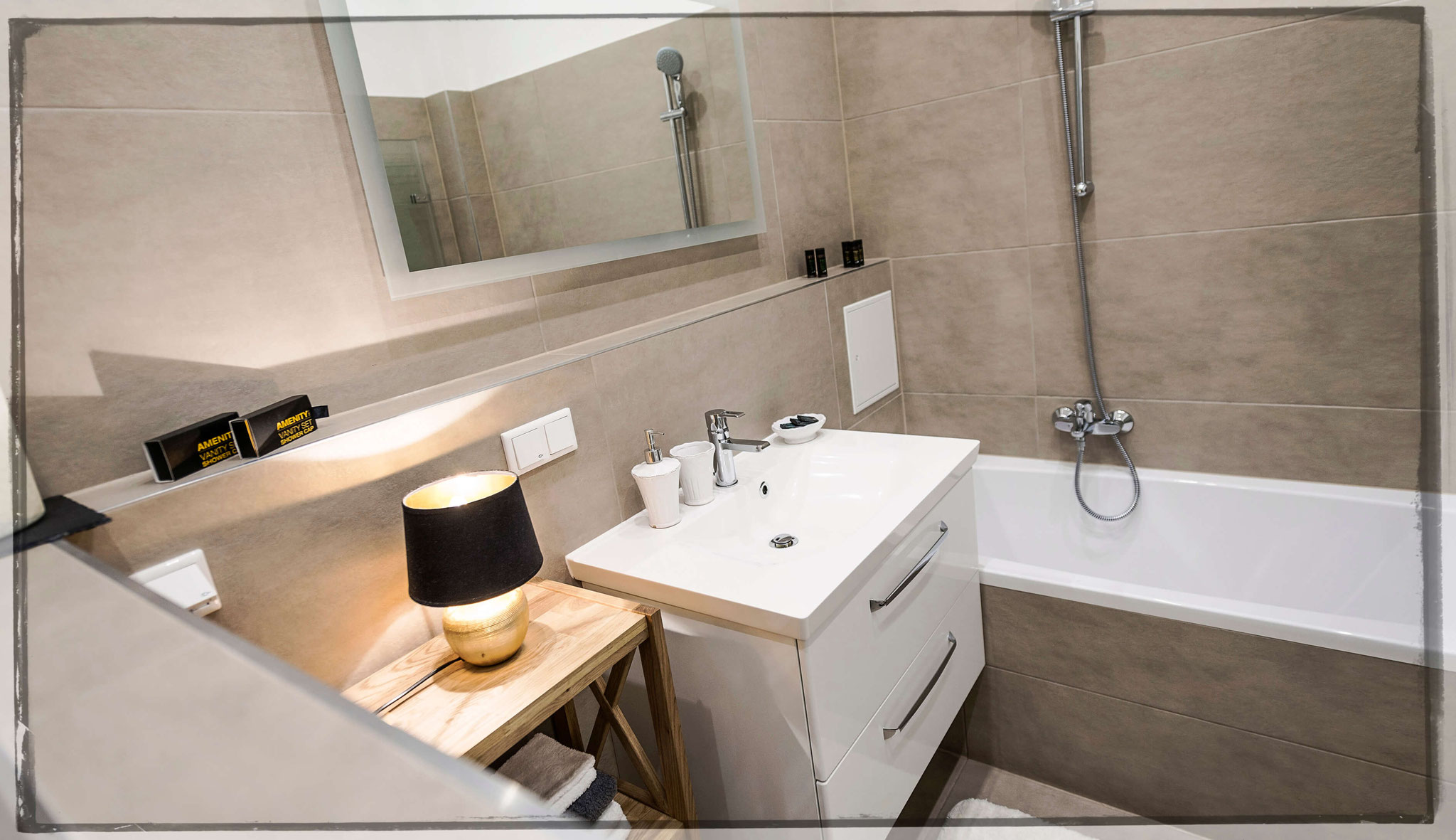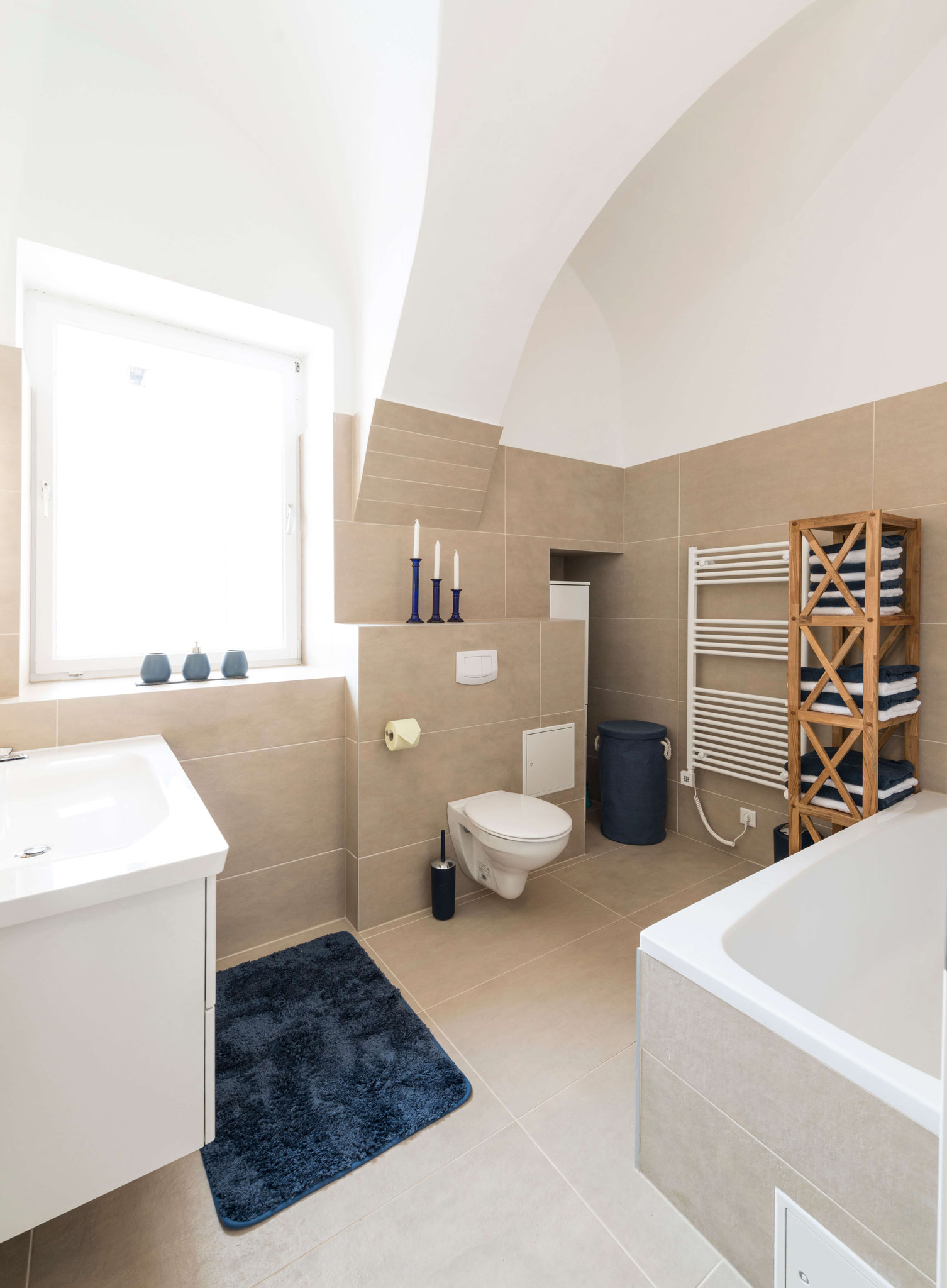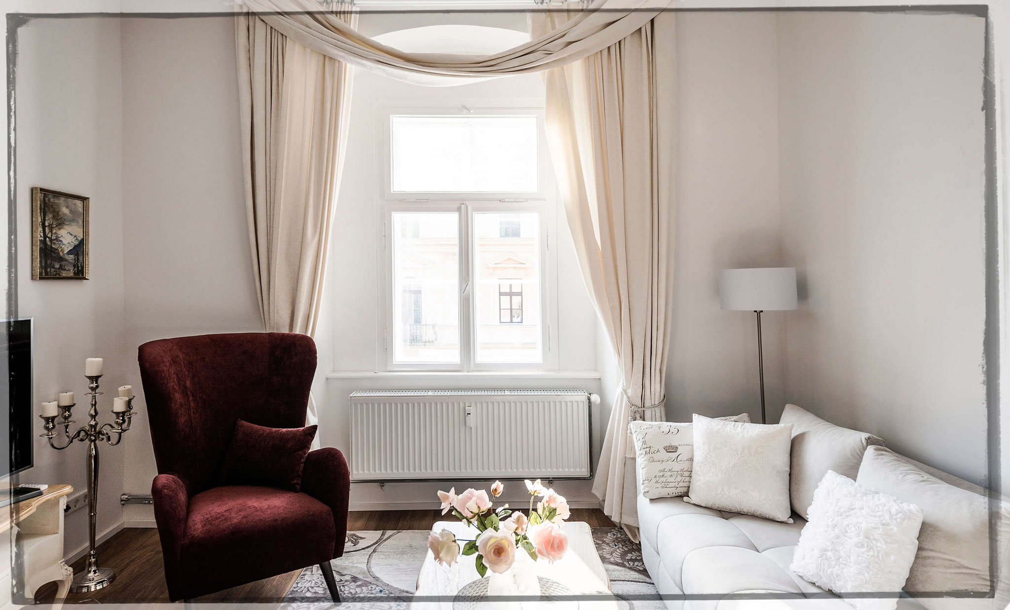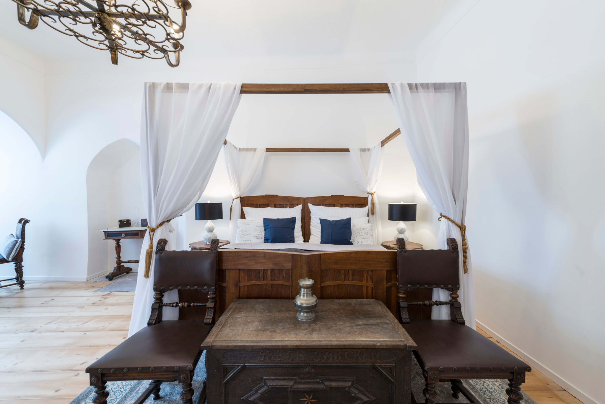 Located on the first floor, this apartment offers 127 sqm of space for relaxation. You can still feel that the emperor resided here in the 16th century. Modern, cozy sofas with fresh color combinations, a heavenly four-poster bed, and a generous dining table for you and your loved ones await.