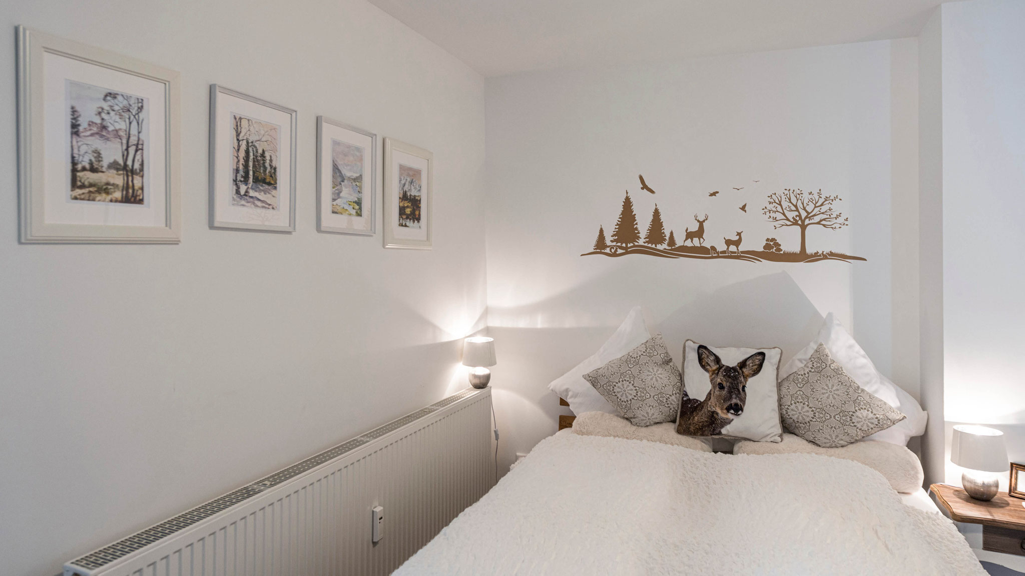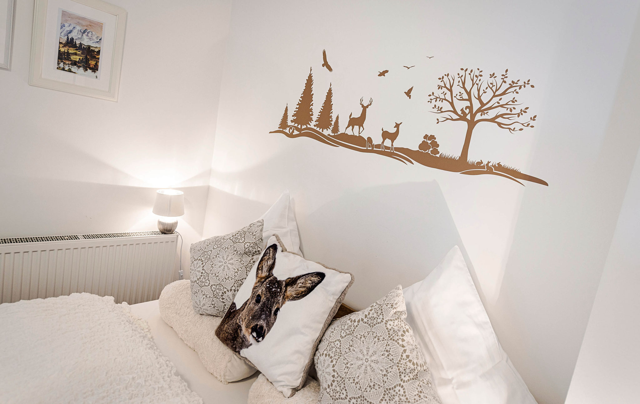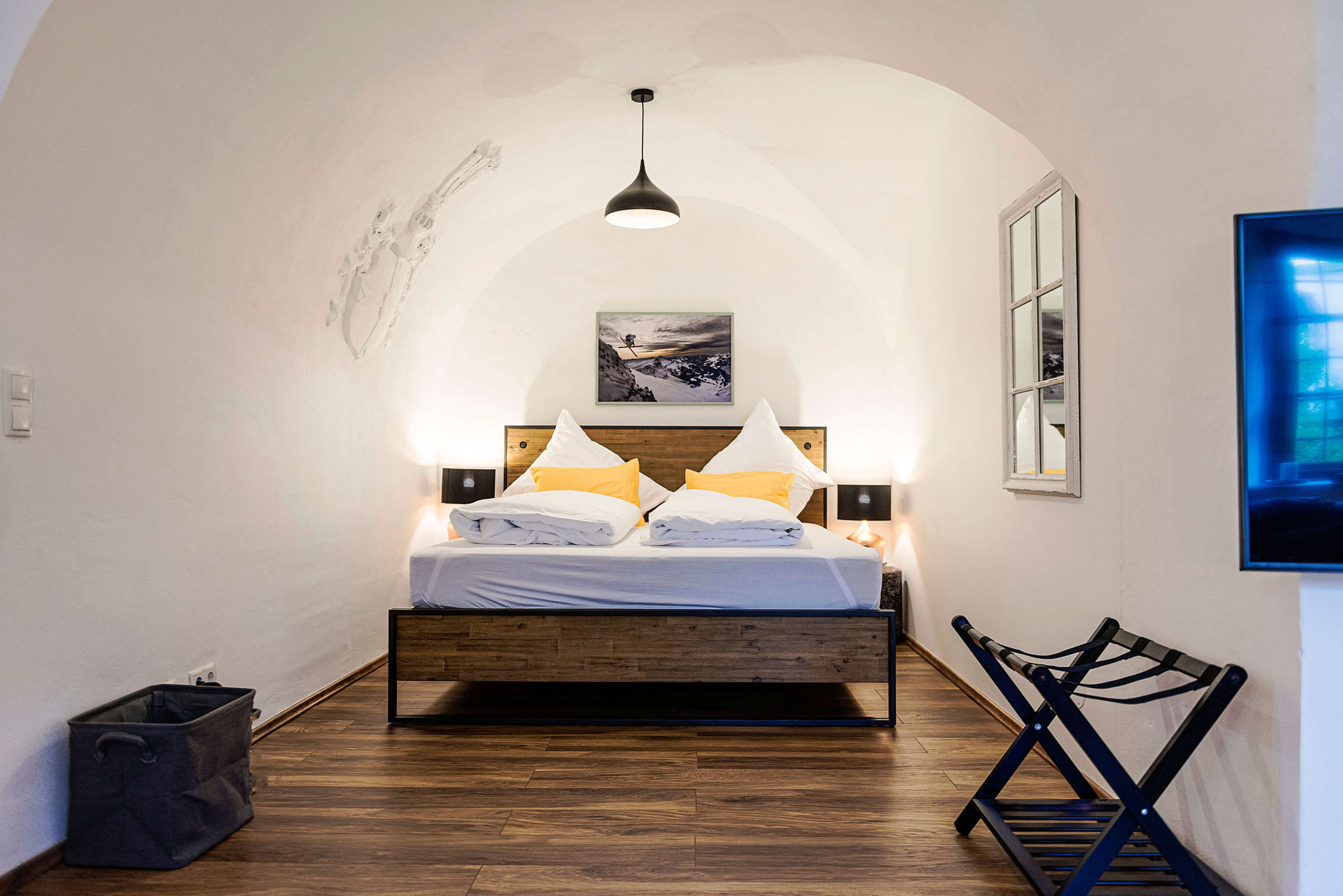 The most spacious apartment on the second floor, covering 138 sqm. Here, Biedermeier meets modern colorful elements, featuring a large open kitchen, an impressive dining table, and a cozy fireplace. Heavenly dreams await in the king-size box spring bed with a picturesque view of Bad Aussee and the surrounding mountains. Additionally, there’s a second bedroom, and another bed can be set up in the living room for two.
