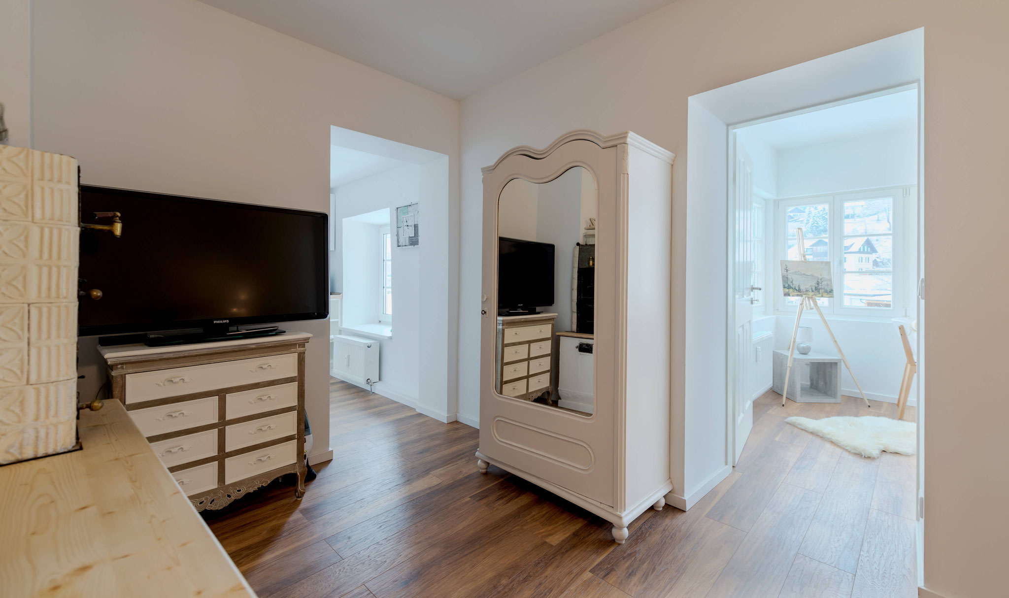 A historical easel, the antique stove, and several paintings still remind us of the good soul of the house, the gifted watercolor painter Gertrude Hofer. This charming 45 sqm apartment on the second floor enchants its guests with tasteful furnishings and a light-flooded veranda.