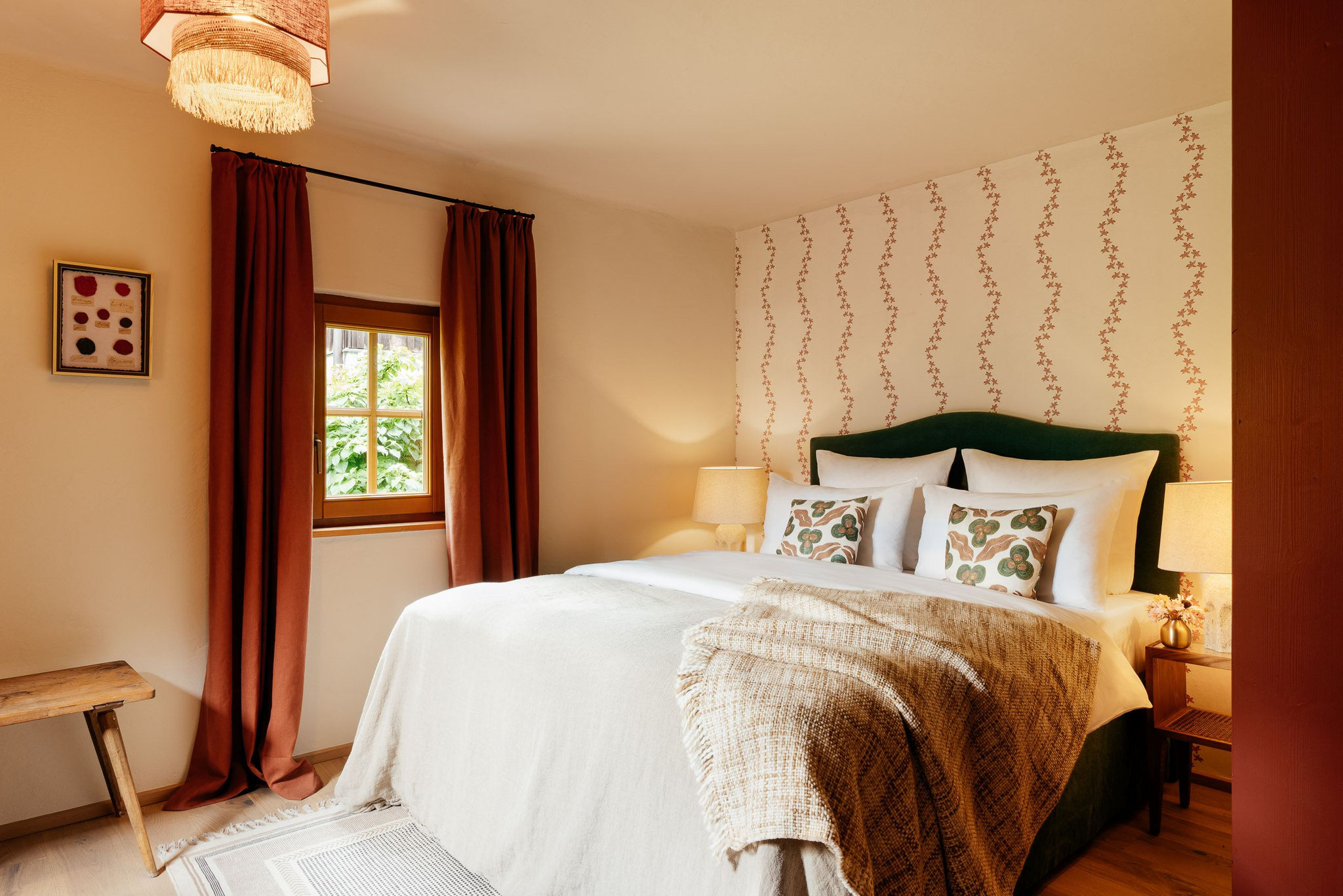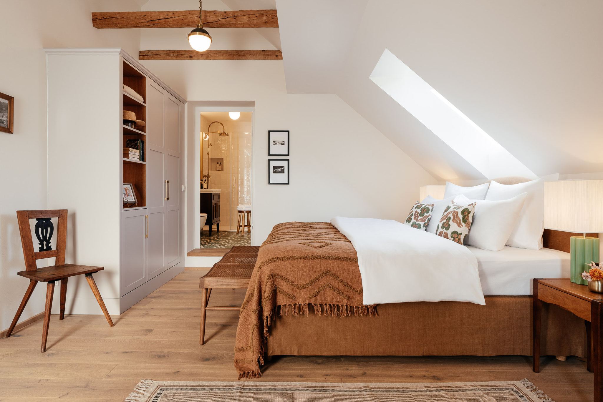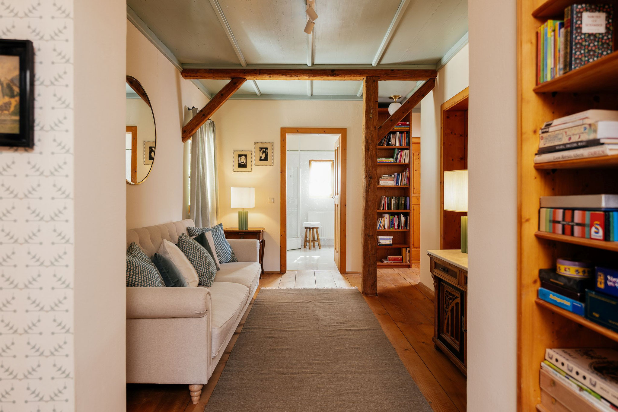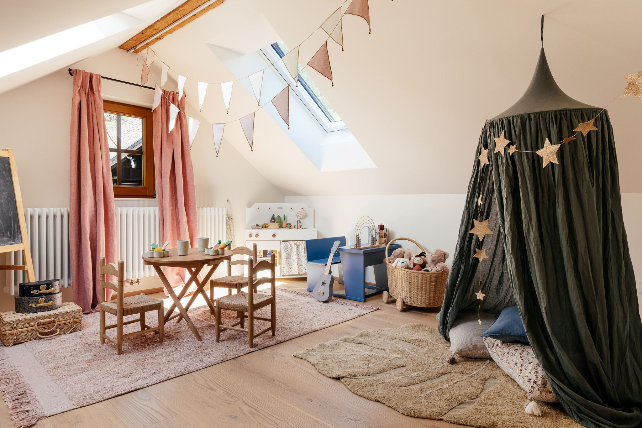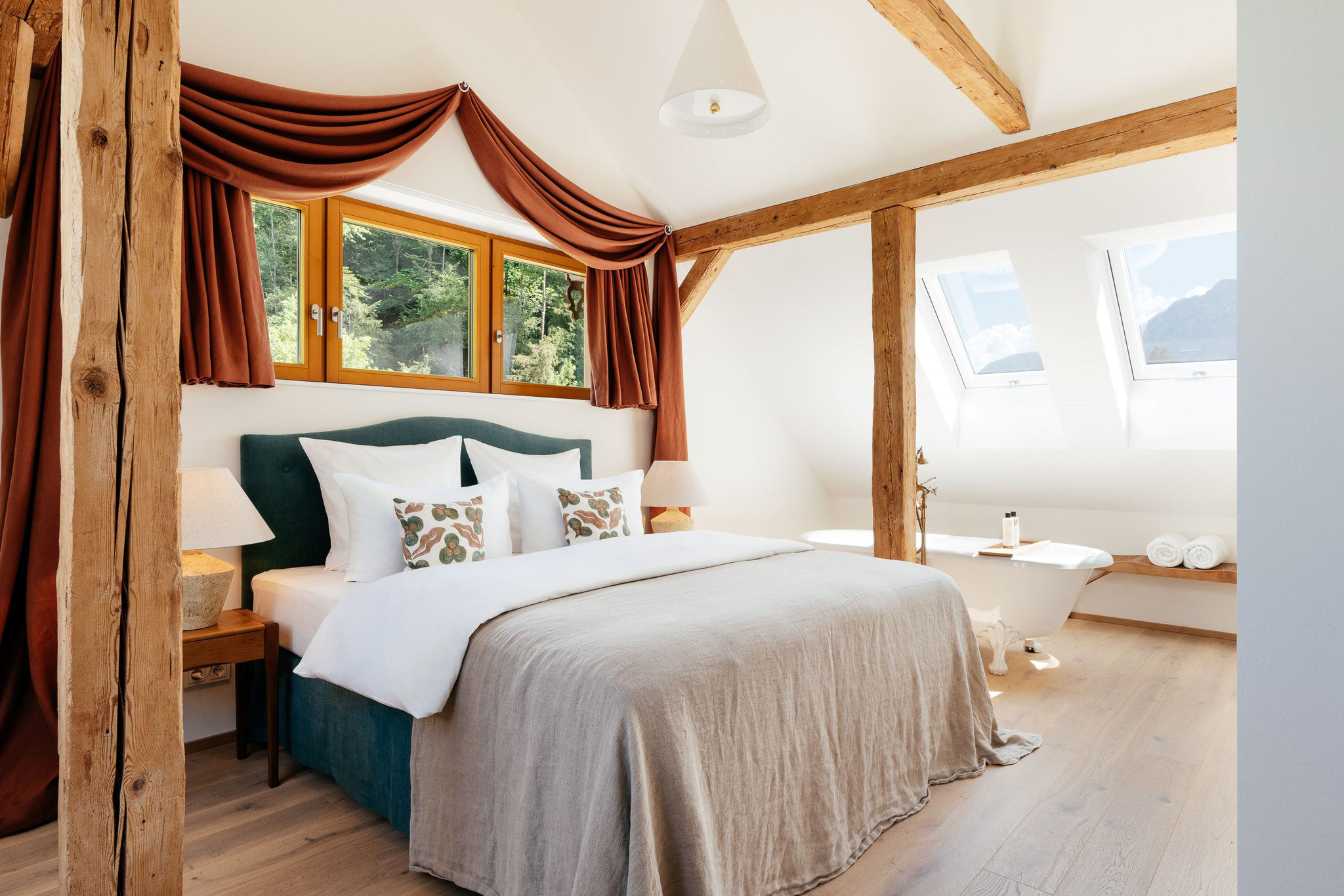 The top floor features two master bedrooms with king-size beds and direct access to a sunny balcony. Children can have fun in the lovingly equipped playroom. You’ll also find a bathroom and the highlight of the floor, a freestanding bathtub.