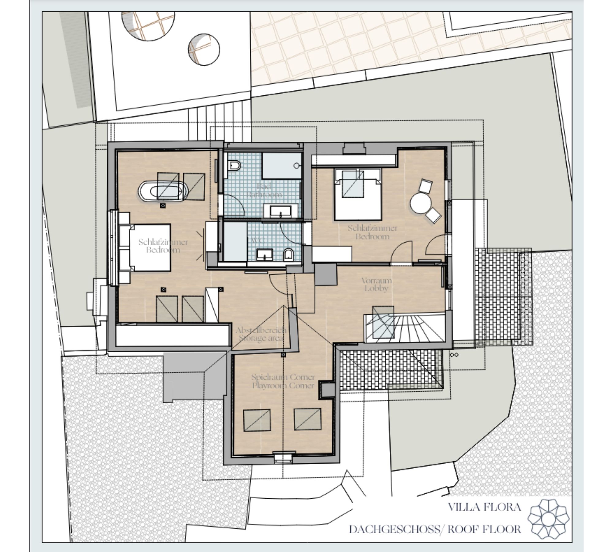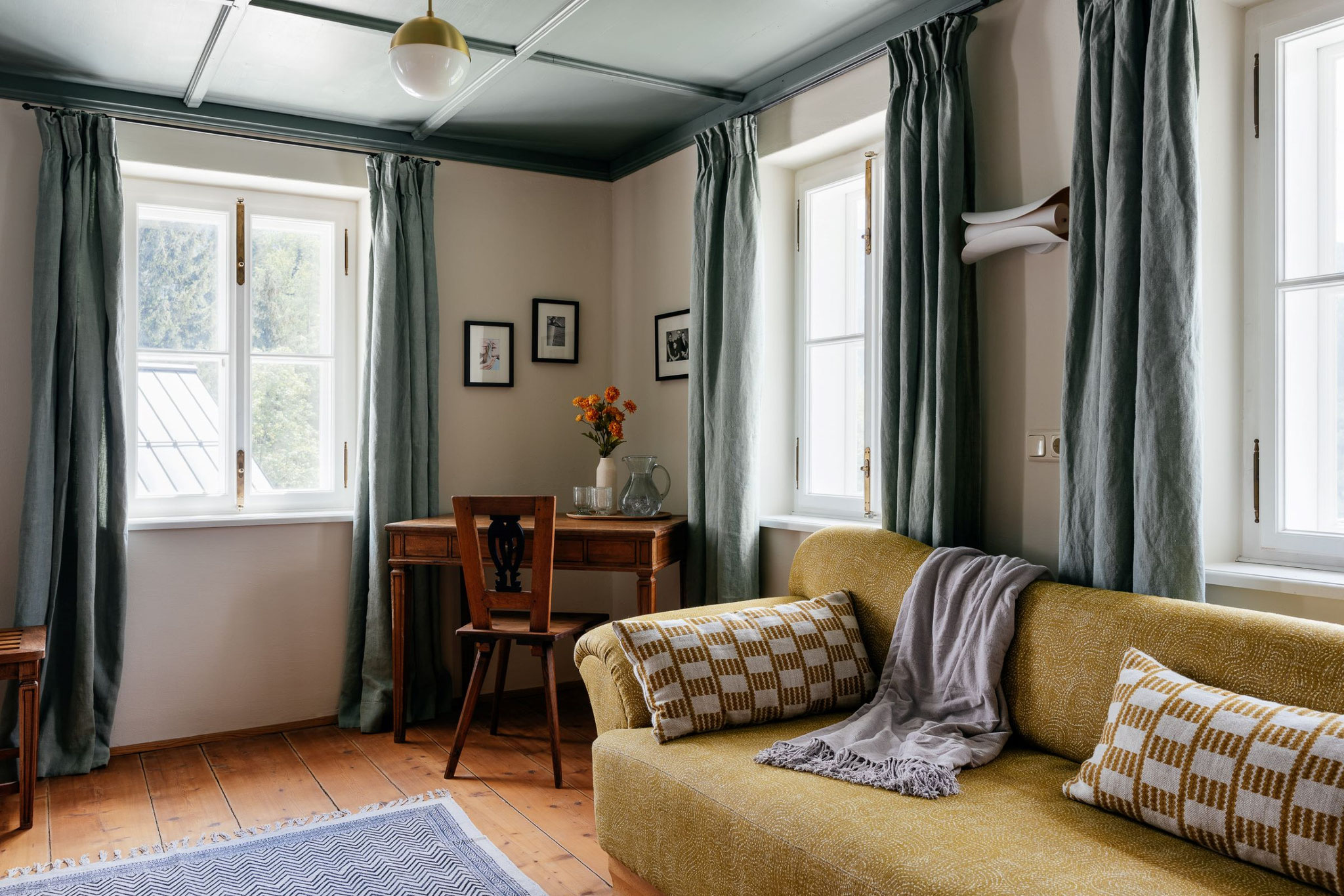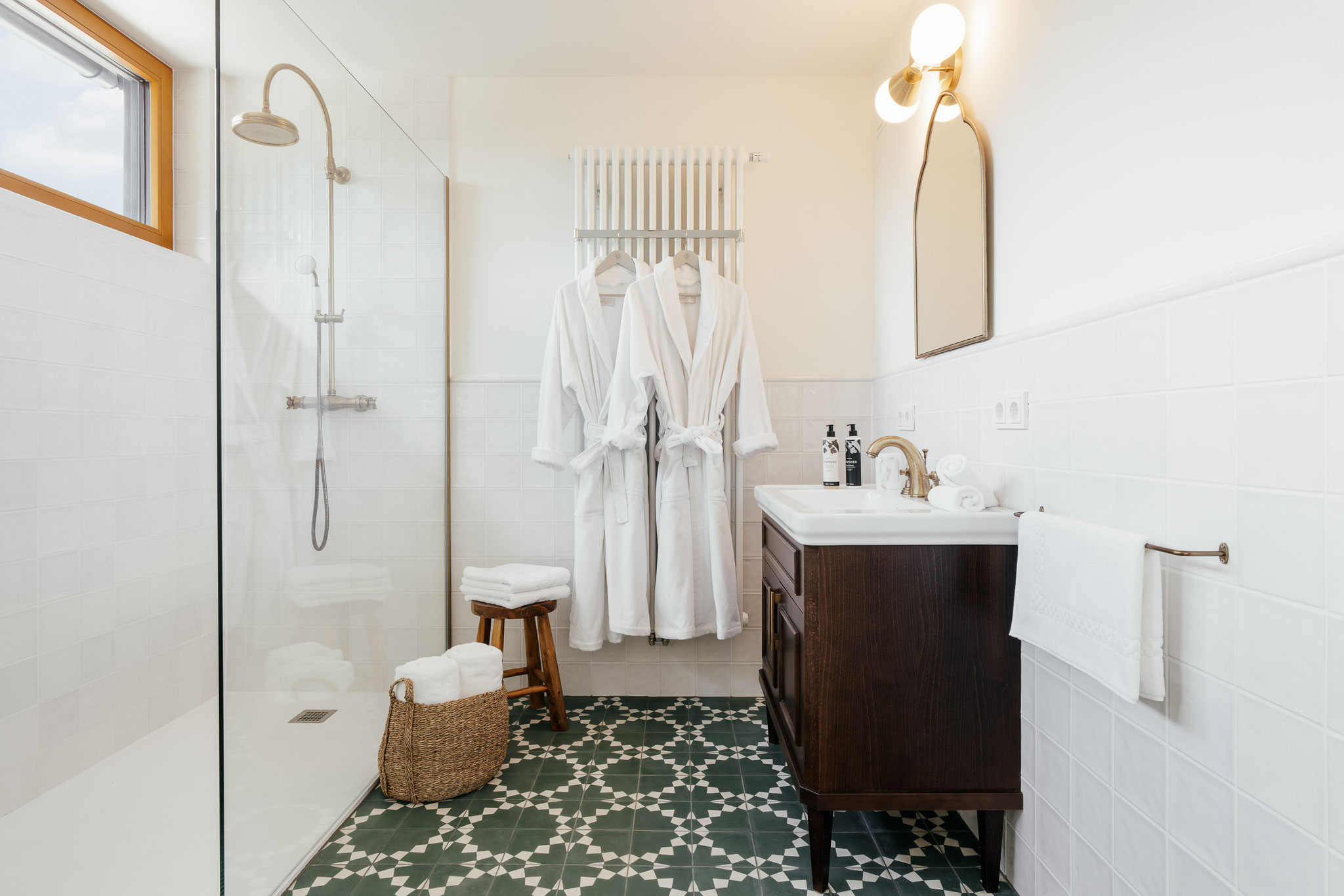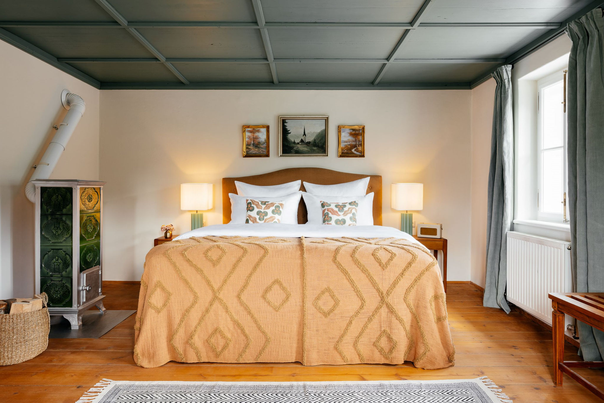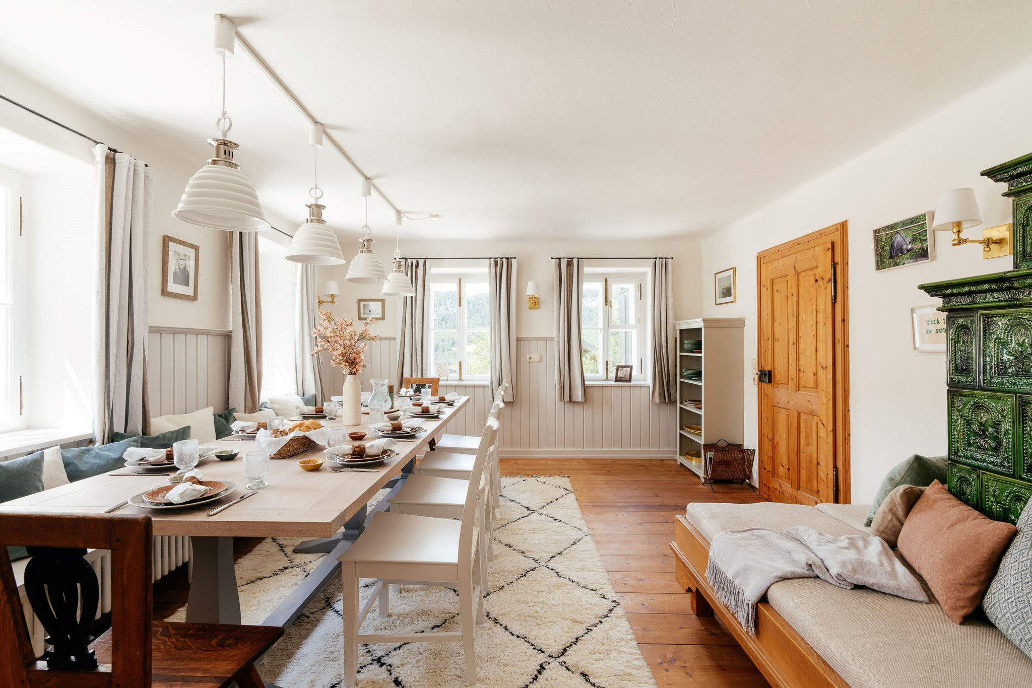 The top floor features two master bedrooms with king-size beds and direct access to a sunny balcony. Children can have fun in the lovingly equipped playroom. You’ll also find a bathroom and the highlight of the floor, a freestanding bathtub.